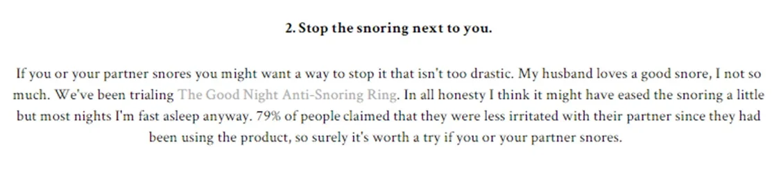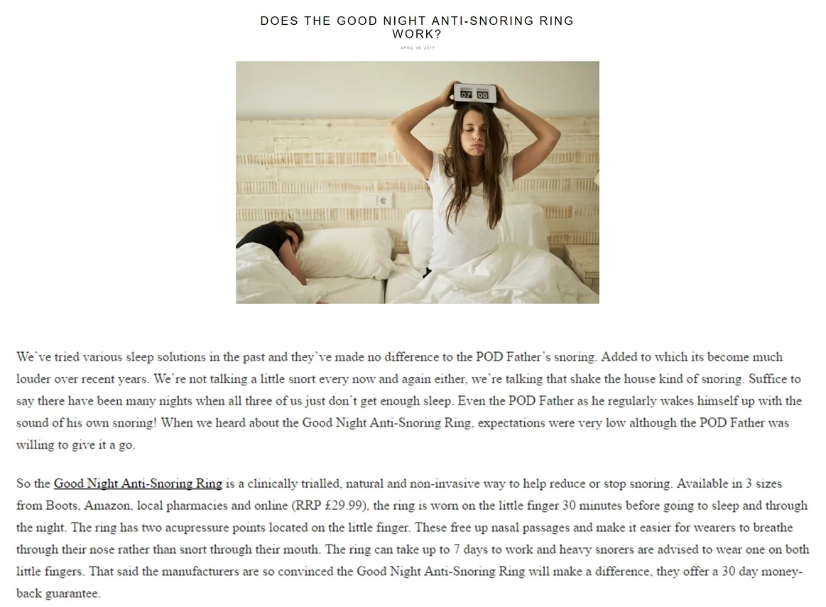 Our client, The Good Night Anti-Snoring Ring, is a natural, non-invasive product to help reduce or stop snoring. We recommended that we target blogger and organise authentic product reviews to increase sales.